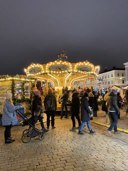 Una volta attraversata la strada, ci siamo trovate difronte a Kauppatori da dove potevamo vedere tutti i bei chioschi di legno che ci aspettavano. Una volta all'interno del mercatino si sentiva nell'aria la vera atmosfera natalizia, fatta di luci, gente sorridente e spensierata, bambini sulla carosello e profumo di cannella, glögi e cioccolata calda. Al principale mercatino di Natale potrete trovare una vasta gamma di idee regalo come candele artigianali, palle di Natale, ceramiche, prelibatezze finlandesi, souvenir, sciarpe e cappelli e molto altro. Quest'anno mi è sembrato che ci fossero più chioschi del solito, probabilmente perché la location è leggermente più grande rispetto a Senaatintori. E quest'anno il mercato ha due sezioni diverse: il mercatino di Kauppatori è il tradizionale mercatino di Natale, mentre quello di Esplanadi è il cosiddetto ravintolapiha (cortile dei ristoranti), dove si trovano diversi chioschi con caffetterie, ristoranti e bar da cui è possibile ascoltare anche la musica dal vivo.